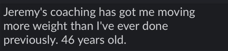 "I am 55 years old and in better shape today than I was in my 30's. My greatest gains have come since working with Jeremy. I cannot say enough about how he has helped me. I have made unbelievable progress toward my fitness goals and I'm a guy that has been lifting weights most of my life. At 55 years old I am deadlifting over 400 lbs. and squatting over 350 lbs. The crazy part is we are just getting started. I expect to continue getting stronger and in better shape following his direction. If you want to make serious gains that will make you a stronger and more confident man you need to work with Jeremy. Stop thinking about it and reach out to him today!" - J